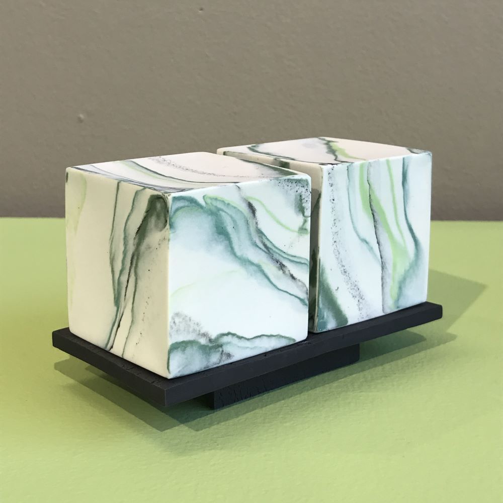 Inspired by the beauty and the power of geology of the South Wales Valleys, this set of two hand-built porcelain cubes are decorated with a variety of green stained porcelain, black underglaze and iron spangles and is presented on a burnt black porcelain plinth.