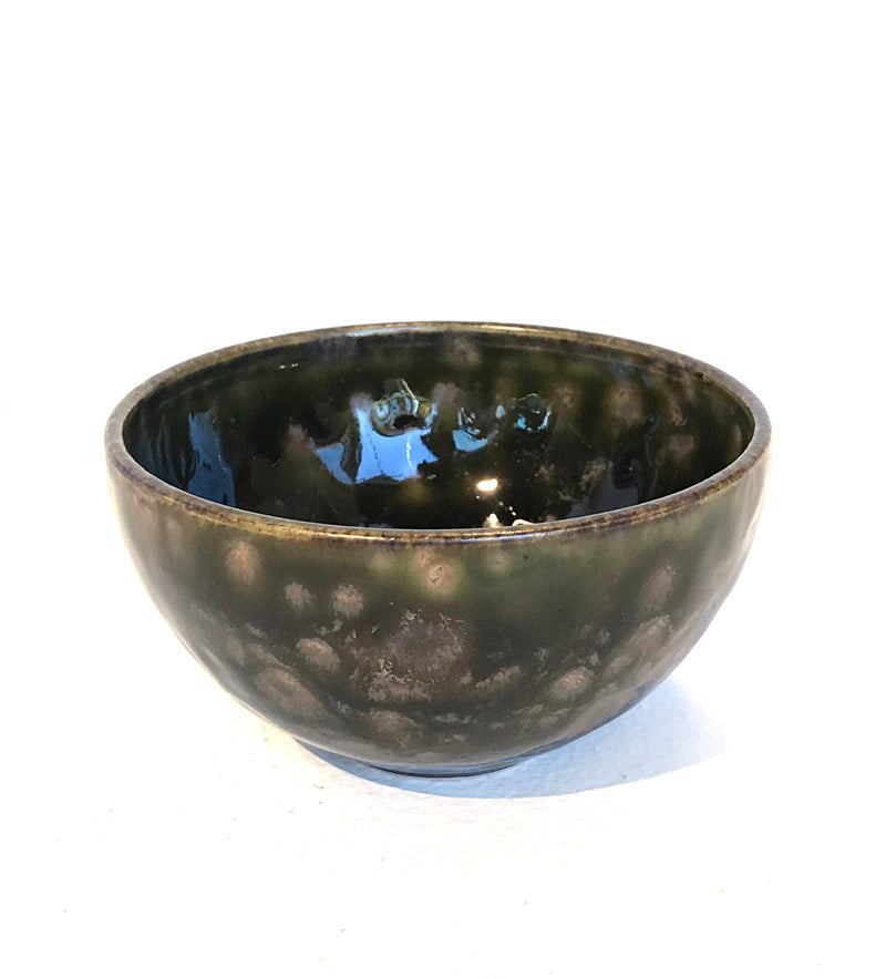 Small tea bowl in a mottled green glaze by potter Ian Rylatt.
