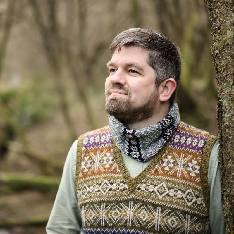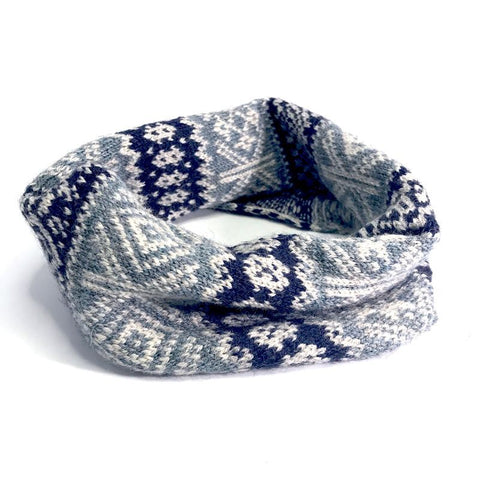 100% British wool snood made on vintage knitting machine, finished by hand. A continuous loop of alternating traditional Fair Isle and Welsh quilting motifs.