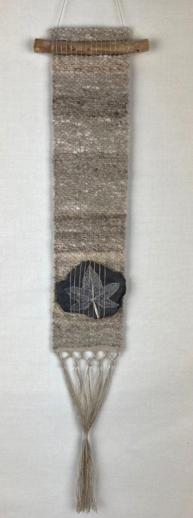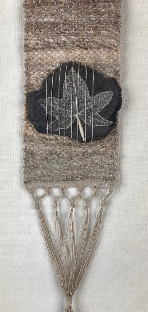 Hanging woven in homegrown handspun flax and slate with skeleton ivy leaves.