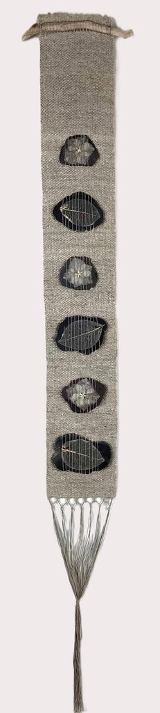 Hanging woven in homegrown handspun flax and slate with skeleton hydrangea flowers and camellia leaves.