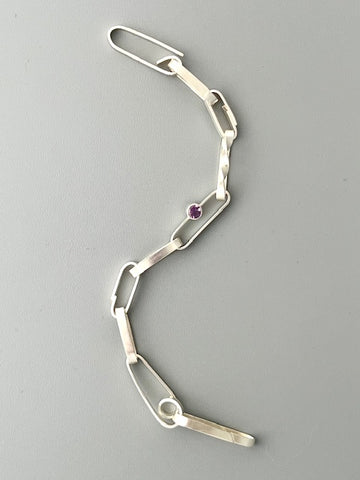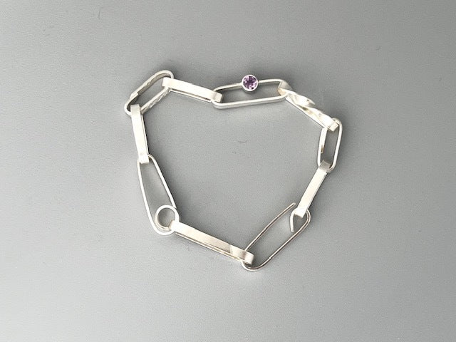 This bracelet features a bezel set purple sapphire, a twist, a loop, faceted texture and an end point link.