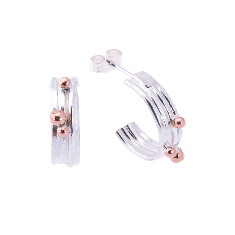 All wrapped up. Layers of silver wrapped and bound together with copper decoration. Made by hand in Sterling Silver with copper granulation.