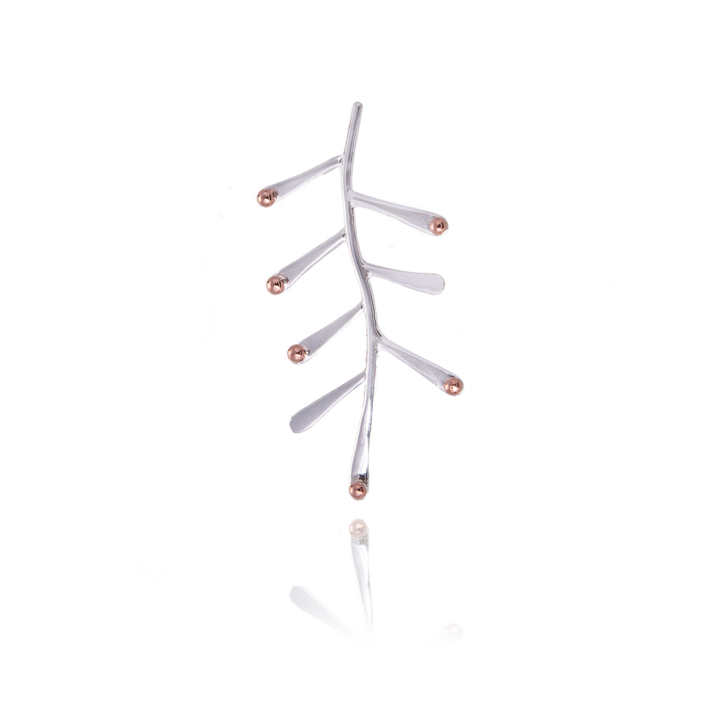 This brooch is inspired by the fern covered hillsides of North Wales. Made by hand at our Welsh workshop in Sterling silver and featuring small granules of pure copper. The brooch arrives hallmarked, and beautifully gift packaged in a high quality branded jewellery box. The brooch arrives hallmarked, and beautifully gift packaged in a high quality branded jewellery box. Materials: Sterling silver and copper Dimensions: 25mm wide x 50mm long.