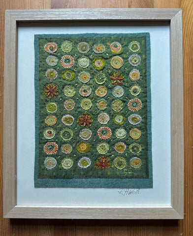 Assorted fabrics and threads, hand & machine stitch | Framed