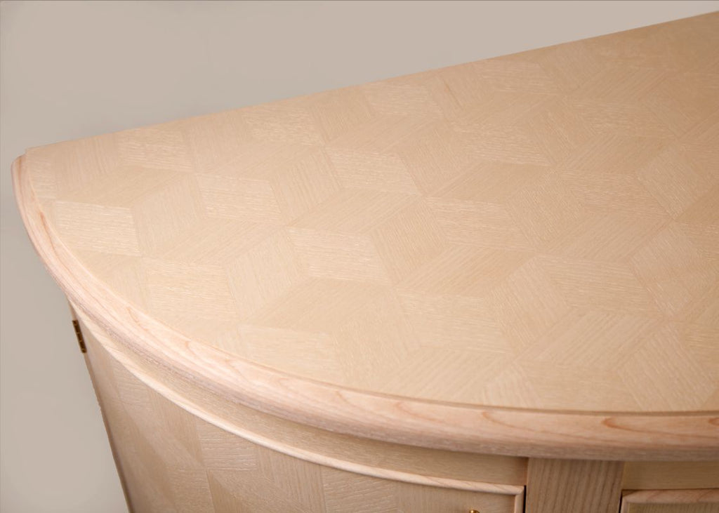 The Marquetry Commode cabinet made by furniture maker Timothy Gwyn John is a play between the traditional forms of ‘fine furniture’ and the timbers used in more vernacular furniture; the result is a commode influenced by an 18th century design made in ash, a timber more likely to be found in furniture within the servants quarters of houses of the period.