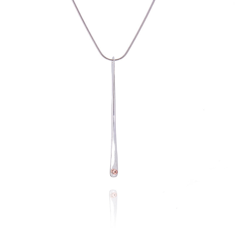 The silver for this pendant is hand hammered and shaped with copper granulation, like seeds, added as decoration. It comes on a sterling silver 'snake' chain which is completely smooth with no visible links.