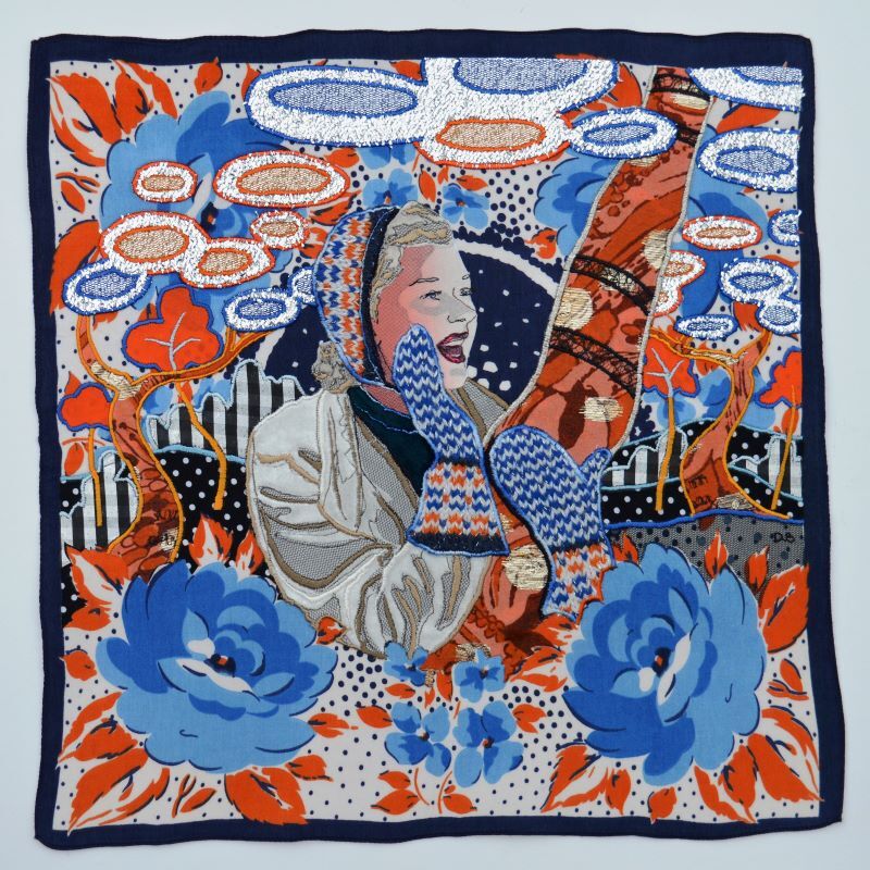 Original freehand machine embroidery and appliqué on vintage handkerchief. Inspired by Clarice Cliff's applique range of hand-painted ceramics.