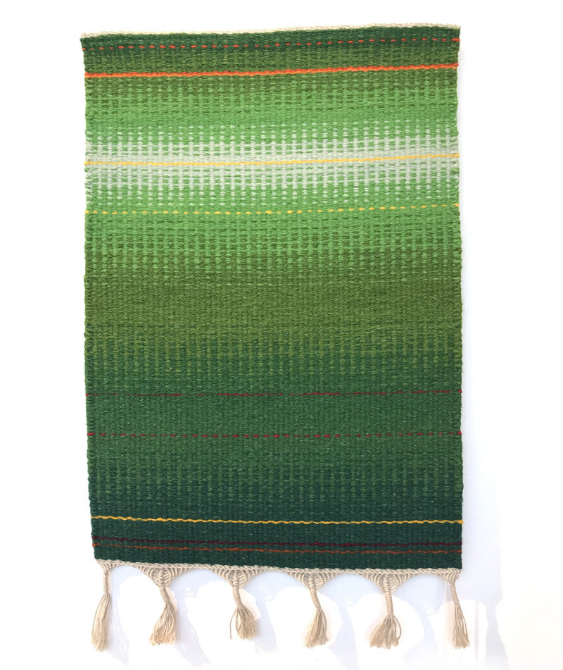 Handwoven small hanging representing the hues of spring meadow by weaver Martin Weatherhead from Snail Trail Handweavers.