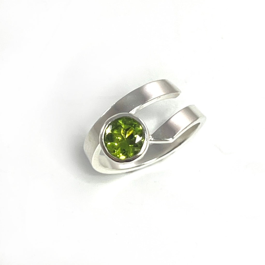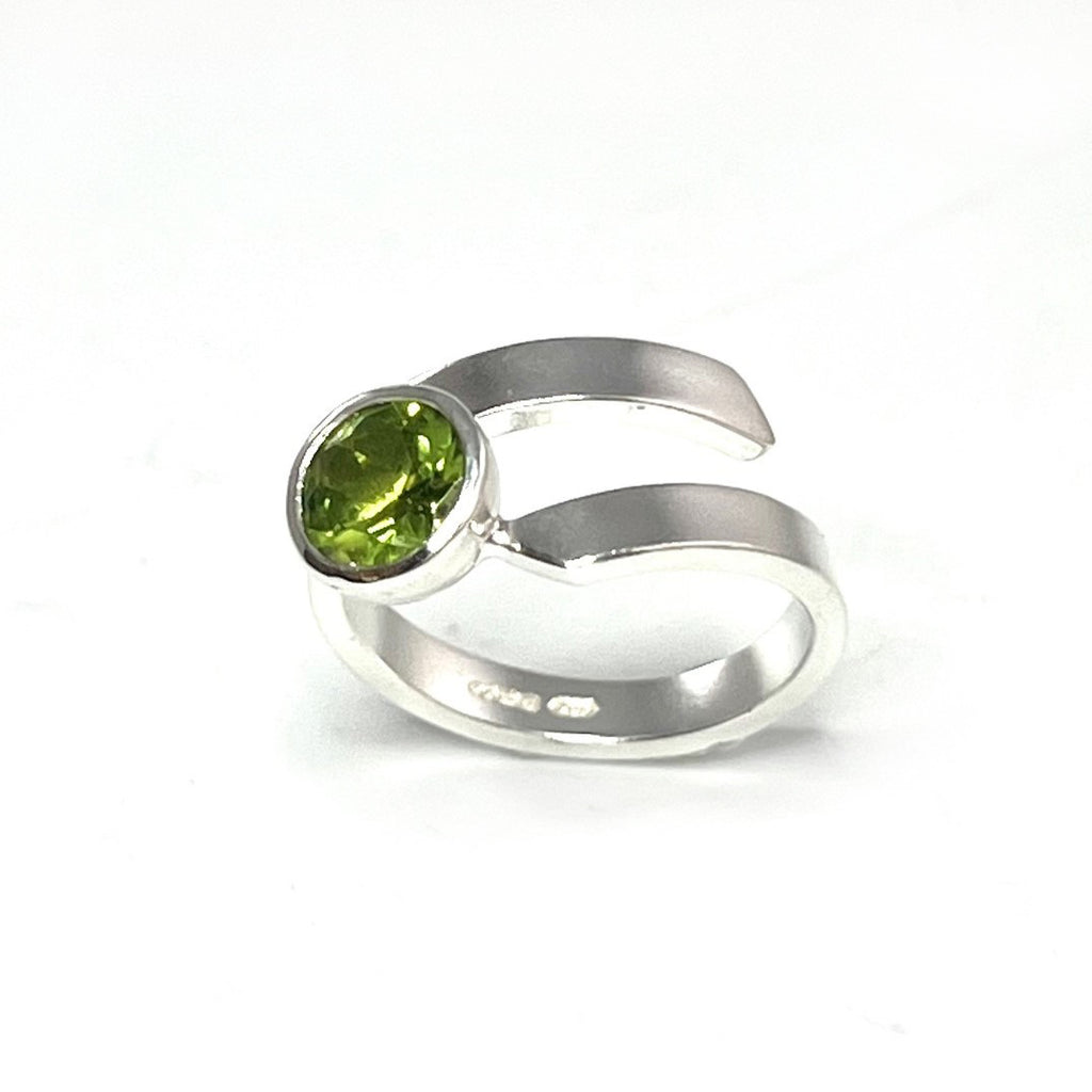 A 3mm ribbon wraps the finger, finished with an offset cup bezel set striking peridot.