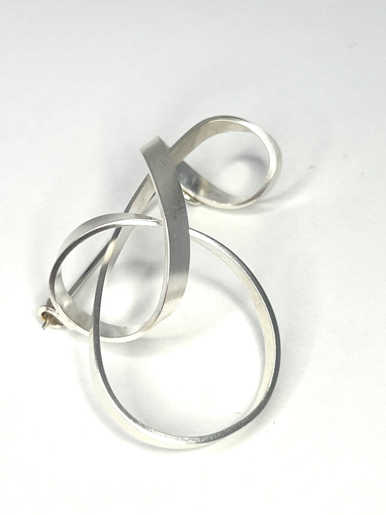 A continuous loop the loop slim silver ribbon creates this Rollercoaster Brooch. Silver pin fastening.