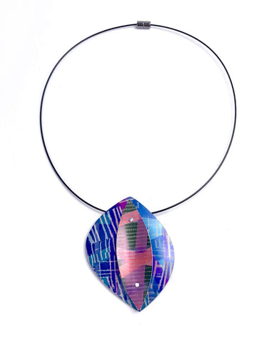 This oval pendant has been individually coloured and is made from laser etched anodised aluminium, this necklace has a nylon/steel choker with a magnetic clasp.