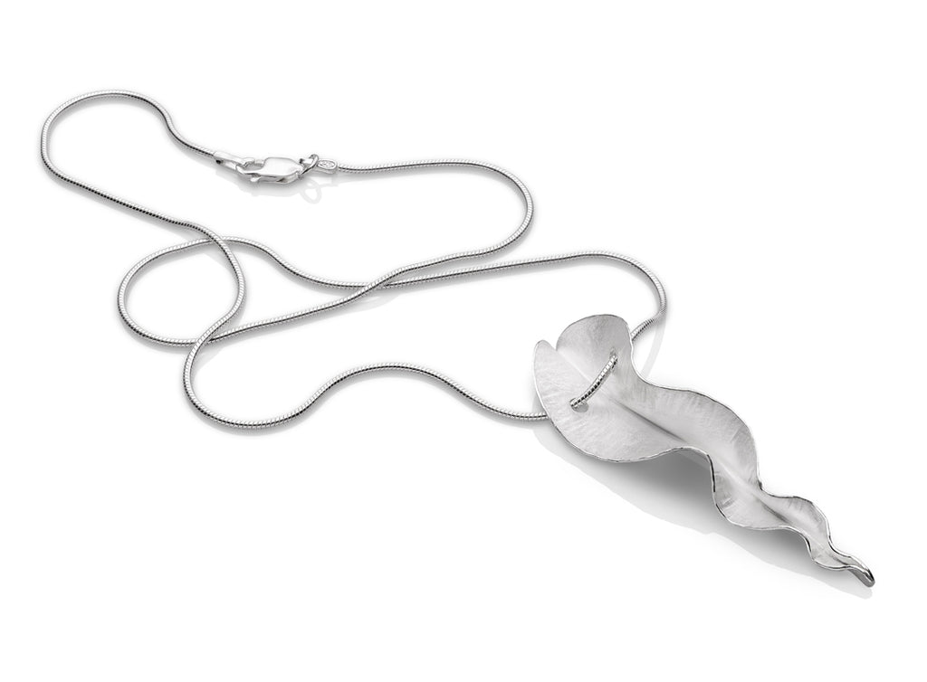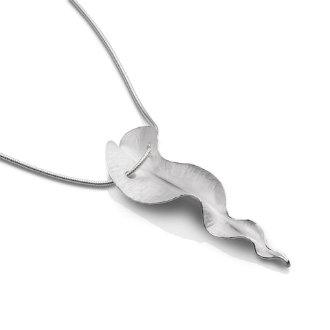 Sterling Silver Harts Tongue Fern Pendant by contemporary jewellery designer Rauni Higson. The pendant is hammered from a single folded sheet of sterling silver creating curves to give a lovely texture to these simple, yet elegant drop pendant.
