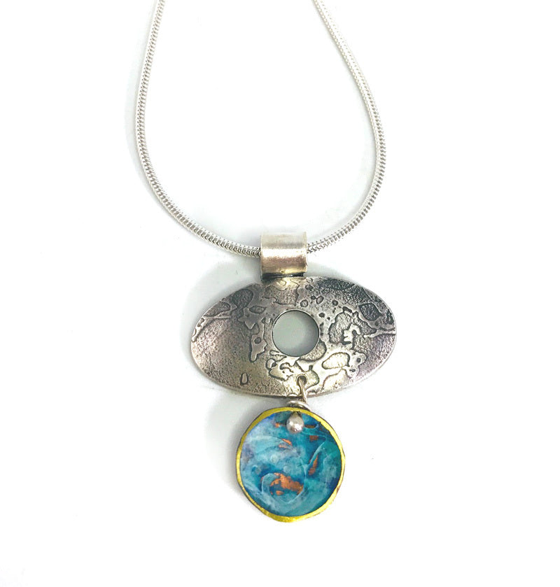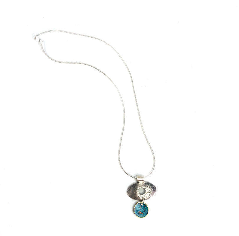 Warm-rain eco-silver ellipse, with blue/green verdigris on brass pendant hung on a 16'' / 40 cm snake chain. The silver texture has been darkened, then the darkness removed on the highlights making the texture show up better and have more depth.