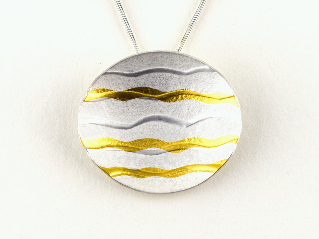 This silver oval shell form pendant is textured with relief waves and 24 carat gold waves are overlaid applied using the asian keum-boo technique.