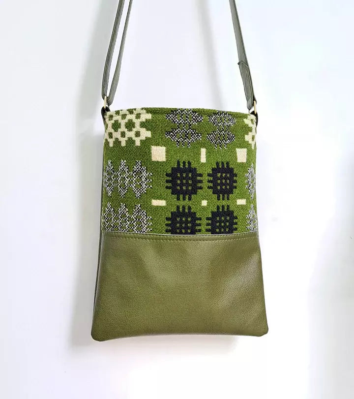This gorgeous striking bag is from Coterie Leather 'Welsh Collection' range, made from salvaged materials, the leather is buttery soft and compliments the colours in this stunning piece of vintage Welsh double cloth perfectly. Shoulder strap long enough to wear across the body, adjustable with antique brass hardware. Interior pocket for phone. Magnetic catch closure.